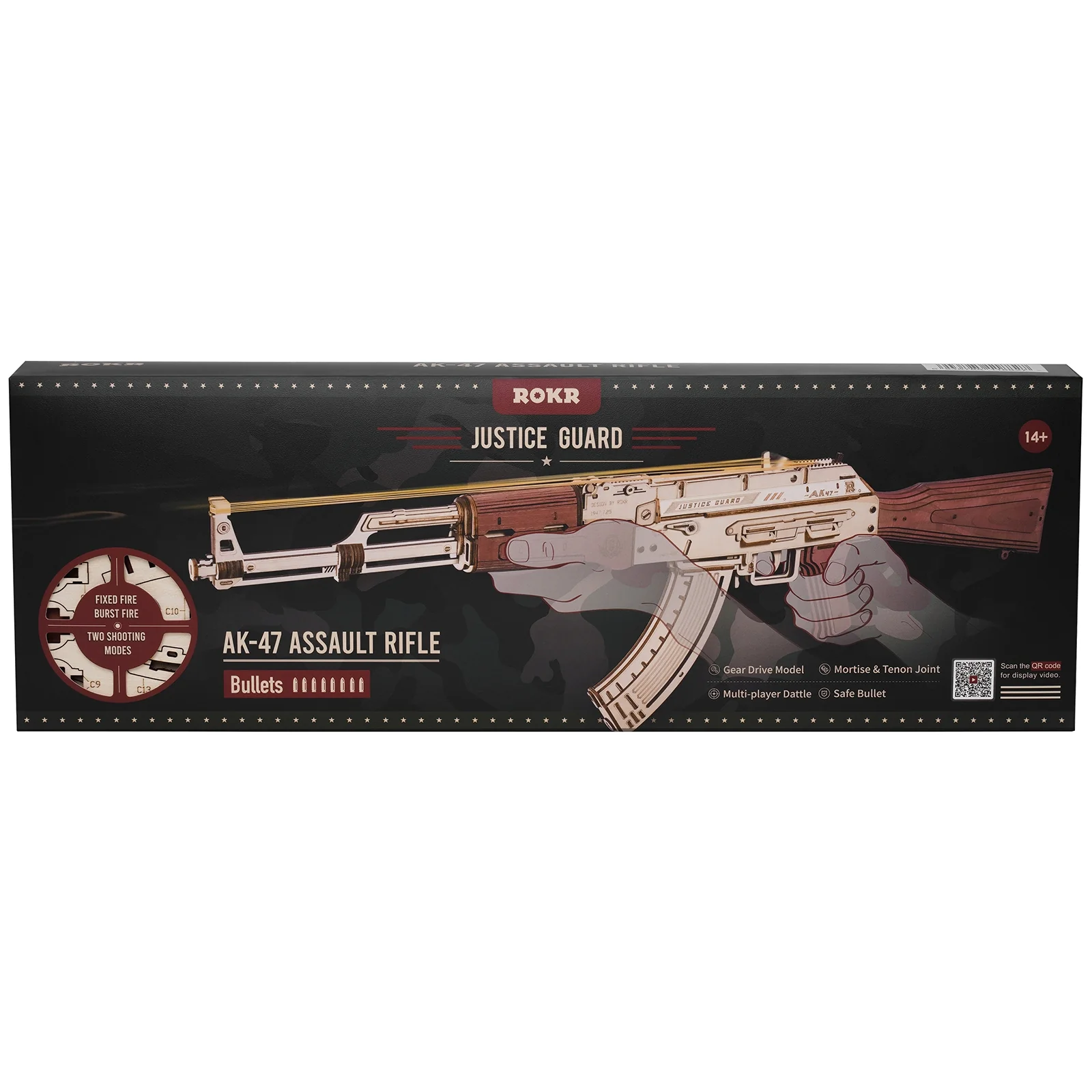 Het AK-47 geweer, ontworpen door de Rus Mikhail Kalashnikov, is over de hele wereld bekend en is een veel gebruikte prop in films. Het geweer heeft het nummer 47 omdat hij al in 1947 is ontworpen! Het is een iconisch wapen dat bijna 100 jaar later nog steeds gebruikt wordt en om zijn gemak van in elkaar zetten geroemd wordt. Net als in het echt heeft jouw houten bouwpakket het kenmerkende gebogen magazijn en de stevige houten kolf. Zou je teleurgesteld zijn als je er niet mee kon schieten? Dat dachten we al wel, dus je kunt er echt mee schieten!