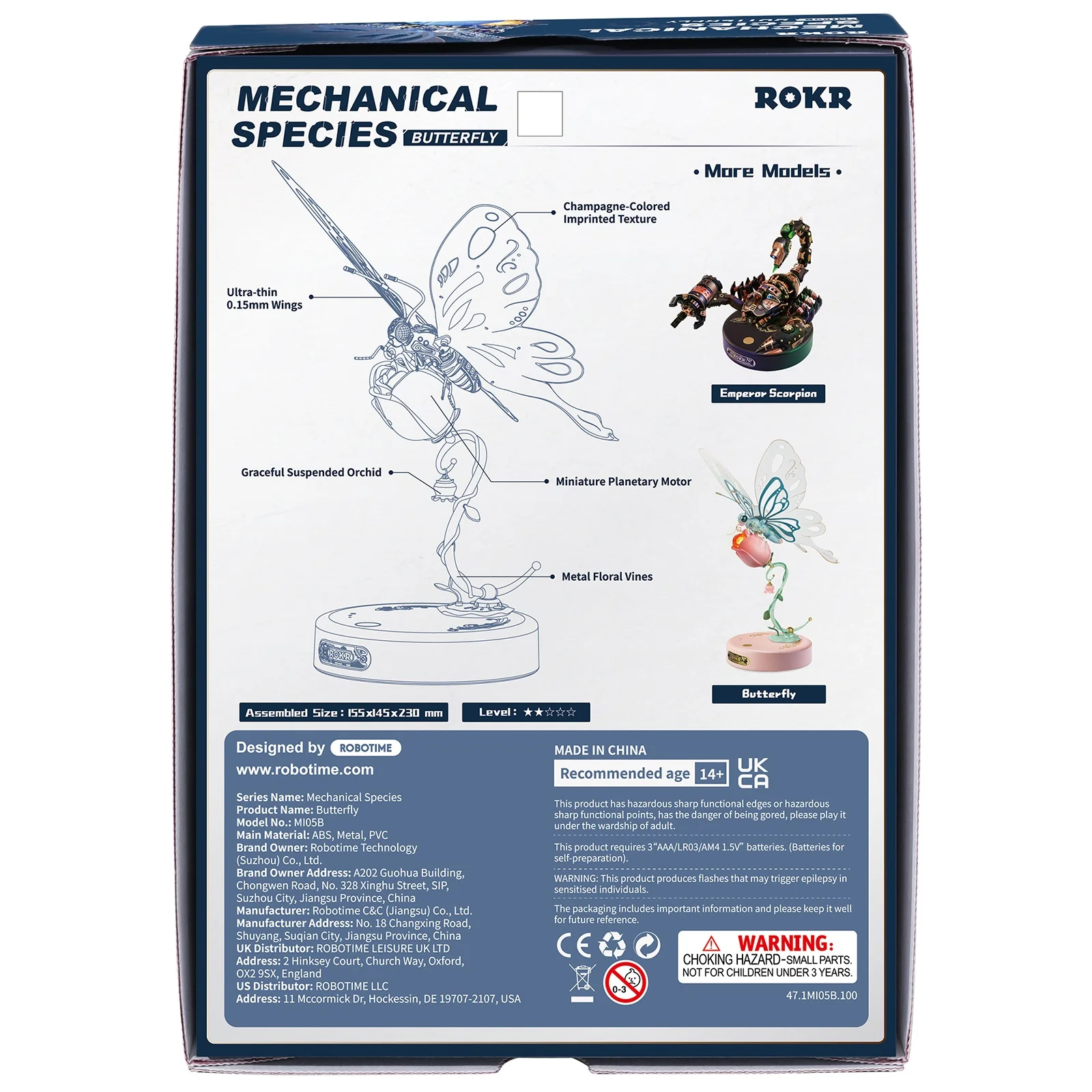 Als je hem af hebt, is hij 23 centimeter hoog. Samen met deze vlinder zijn er bij ROKR nog een hele serie andere insecten ontpopt. Er is nog een roze vlinder, een rode gevechtskever, maar ook minder lieve insecten zoals een schorpioen, een neushoornkever en een vliegend hert. Allemaal bewegen deze mechanische bouwsets.
