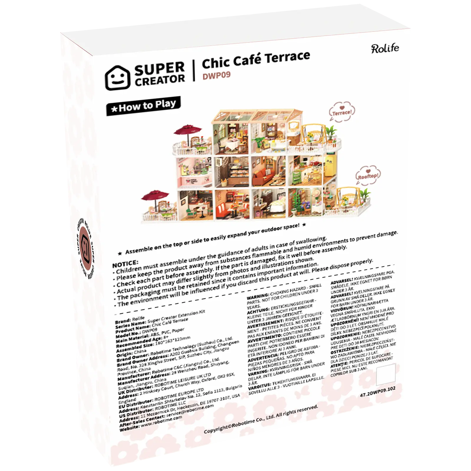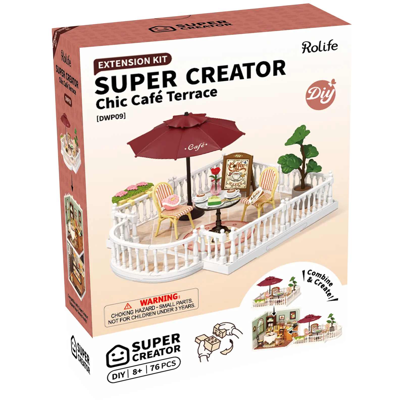 Heb je de smaak te pakken? Wij denken van wel, want hoe leuk is het om deze flexibele serie helemaal naar je eigen zin in te delen. Combineer dit terras dan met andere sets uit de Rolife Super Creator serie zoals de ijswinkel of de bloemenwinkel! Klik dit terras aan de zijkant, voorkant of plaats dit terras bovenop voor een dakterras met uitzicht! Maak je eigen winkelcentrum of een geweldig gedetailleerd poppenhuis. Liever een ander dakterras? Kijk dan eens naar de Sunny Break Terrace!