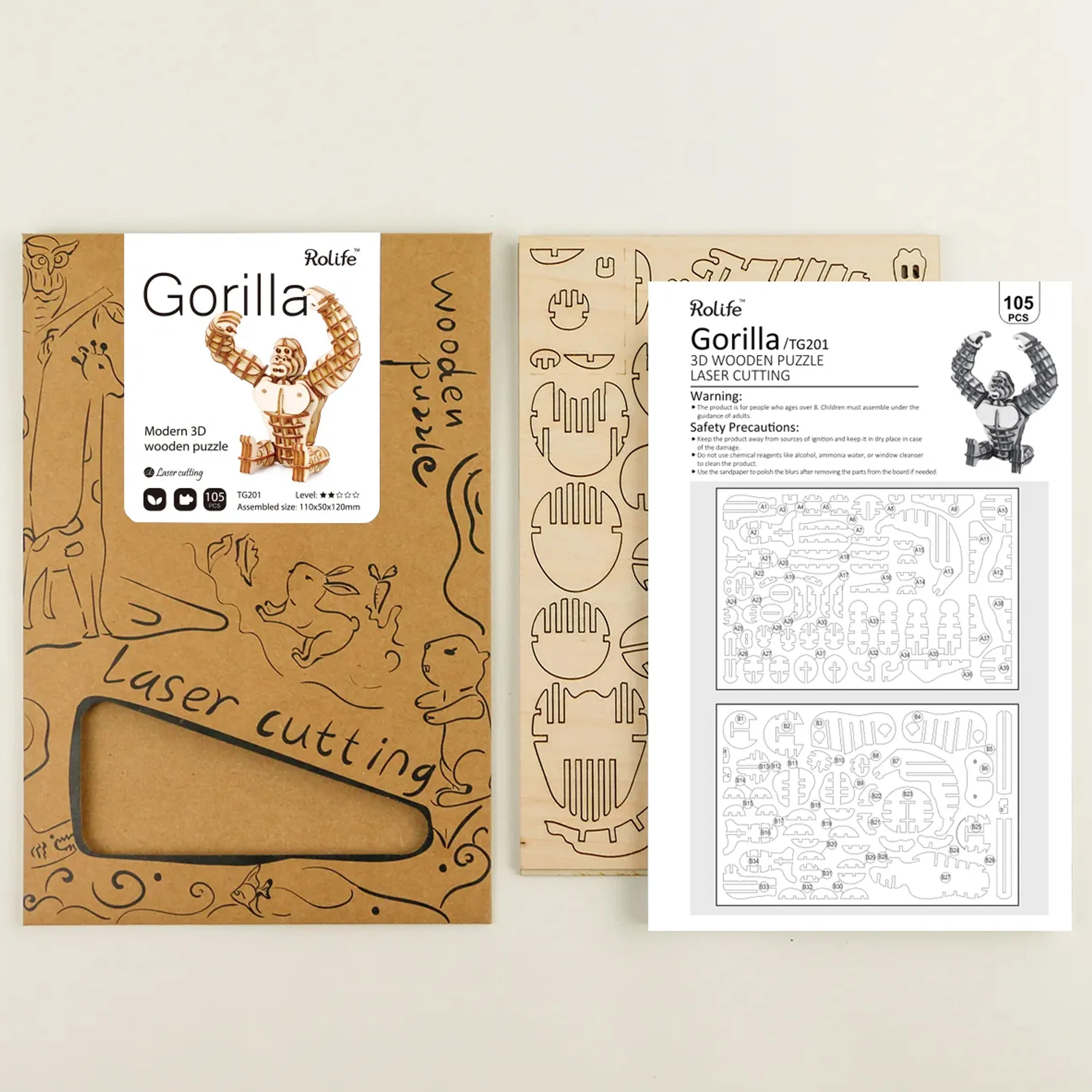 Deze houten 3D-puzzel stel je samen uit puzzelstukjes die van goede kwaliteit zijn. Ze zitten in triplexplaten en je haalt ze er makkelijk uit. Dat komt omdat dit bouwpakket met een speciale lasertechniek is voorgesneden. Deze techniek zorgt ervoor dat de stukken een nauwkeurigheid hebben van vijf micron. Dat is vele malen dunner dan een haar! De onderdelen van deze bouwset passen daardoor precies in elkaar met gleufjes. Je hoeft geen lijm te gebruiken! Als je de handleiding volgt, heb je jouw gorilla in een paar uur in elkaar gezet. Je kunt hem erna nog verven als je dat leuk vindt. In ieder geval is hij stoer om te zien.