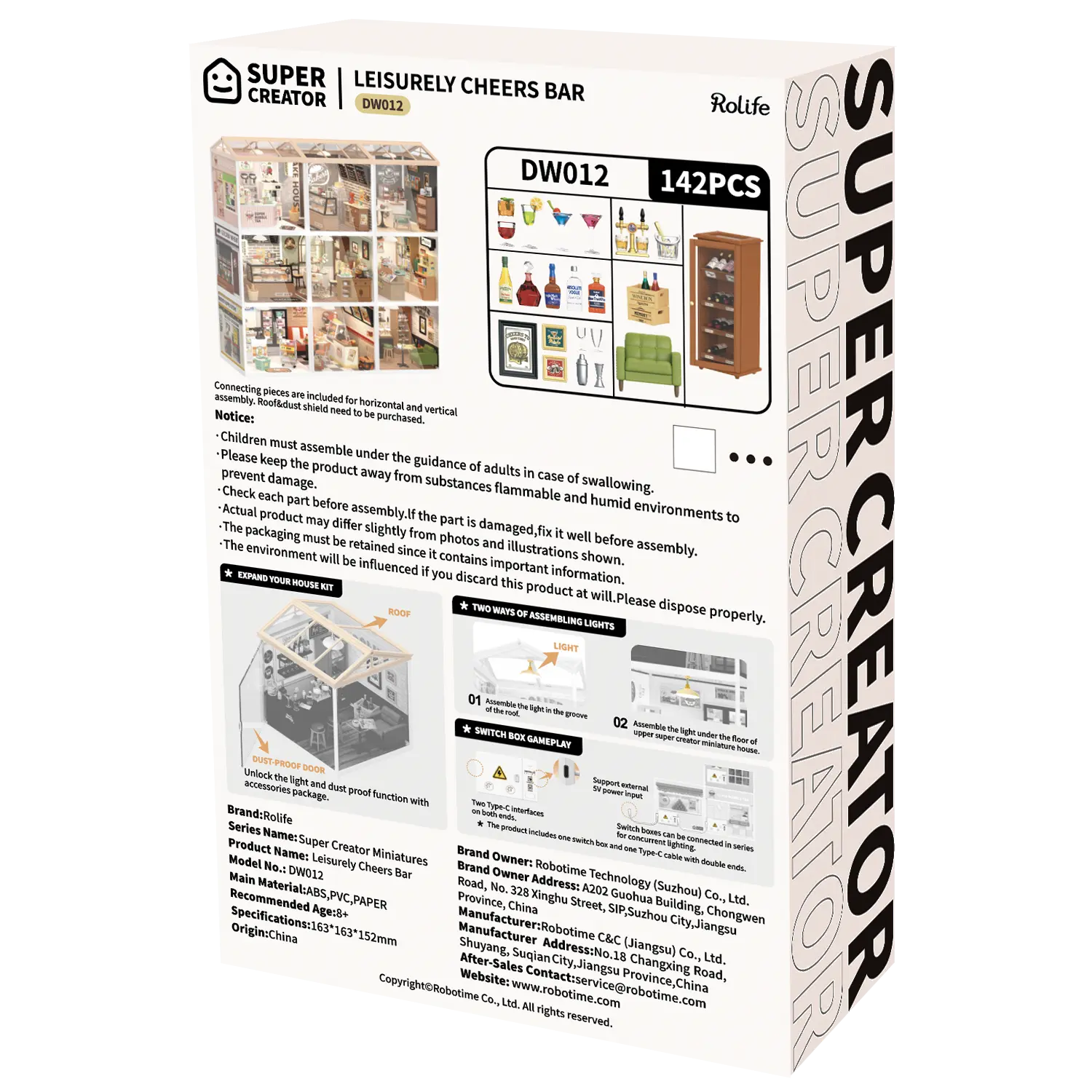 Deze bouwset is onderdeel van de serie Superstore van Rolife. Een waanzinnig leuk concept, omdat je 12 winkels kunt combineren. Je kunt er een winkeltoren, een flatgebouw of een winkelstraat van maken, wat jou leuk lijkt. Het licht kun je dan in serie aansluiten. Je moet overigens een dak of plafond erbij hebben om de lamp op te kunnen hangen. Houd je niet van stof, dan bestel je de transparante gevels erbij, die nog wel open en dicht kunnen.