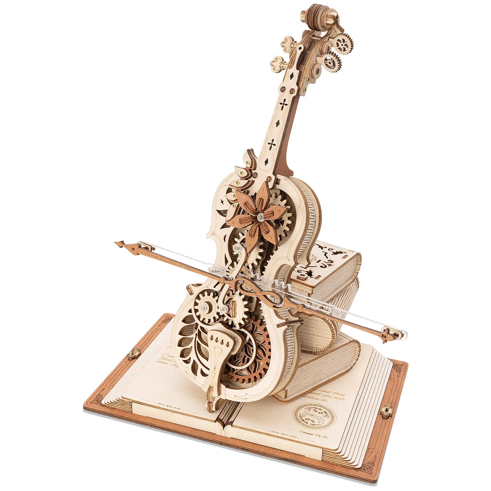 Staand op een dik boek en leunend tegen een stapel nog dikkere, geheimzinnige boeken, speelt jouw magische cello zijn betoverende melodietje. De heldere klanken van het muziekmechanisme rollen door je kamer en gefascineerd kijk je naar de radertjes die draaien. En uiteraard ben je verrukt door de strijkstok die heen en weer gaat. Echt, dit is een van de meest decoratieve vintage ROKR-bouwpakketten die we hebben!