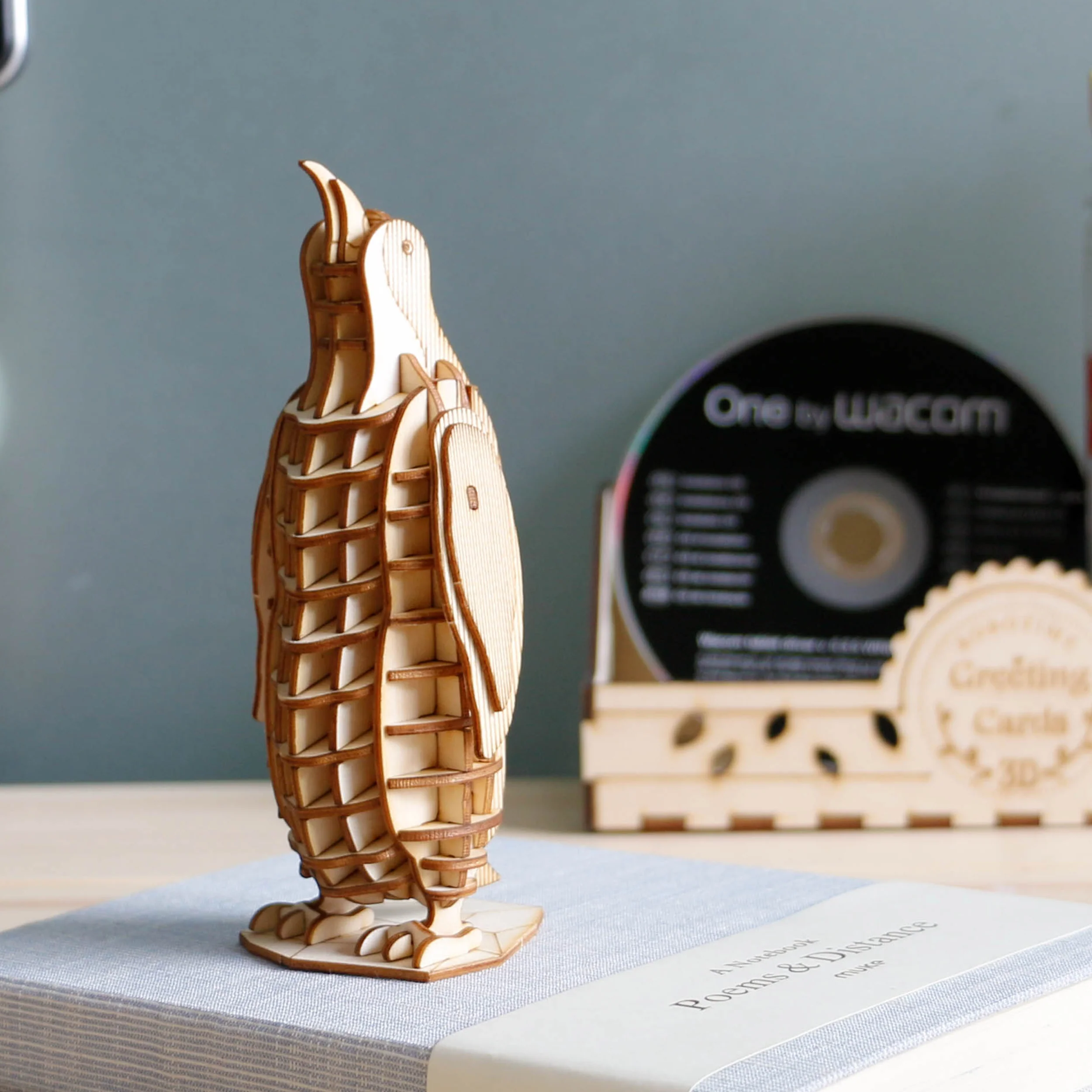 Veel vogels hebben mooie kleuren. Andere vogels zijn superstoer zoals roofvogels. En sommige vogels zijn grappig. Dat zijn er maar een paar en een vogelsoort die iedereen wel grappig vind, is de pinguïn. Omdat het zo'n unieke vogel is, hebben wij hem voor jou van hout nagemaakt en in een bouwpakket gegoten. Jouw nieuwe huisdier staat met zijn snavel in de lucht en roept waarschijnlijk zijn soortgenoten. Zijn grappige voeten leunen op een stevige grondplaat. In deze houding staan ze ook als ze hun ei en jong tussen hun poten klemmen. Die van jou heeft nog geen ei, maar wat niet is …