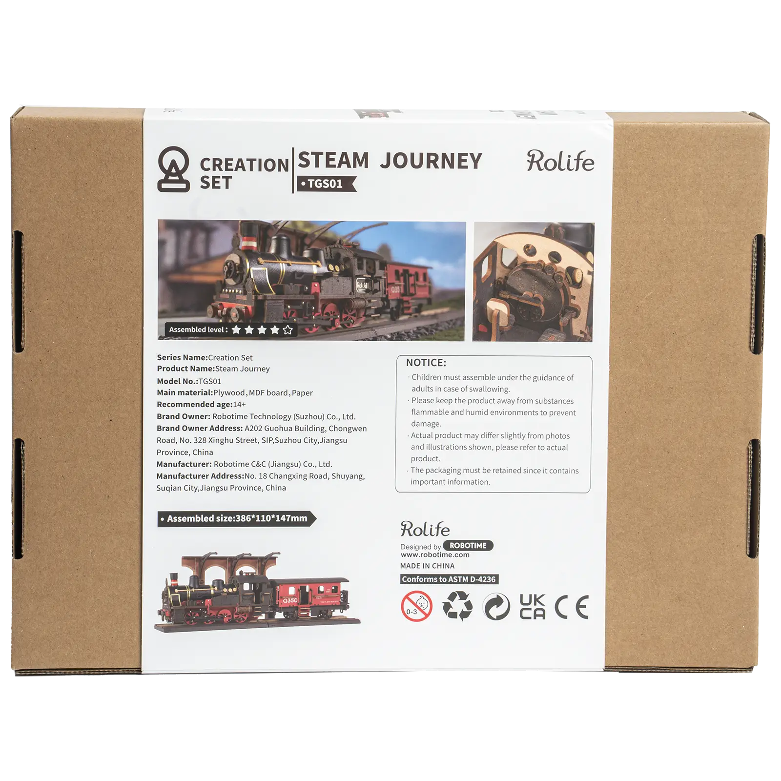 Ben je op zoek naar een cool, uitdagend en gedetailleerd project? Dit bouwpakket van hout van een statische stoomlocomotief is dan precies wat je nodig hebt. De zwarte locomotief met goudkleurige en rode details is een ware eyecatcher en zelfs eyecandy! Achter de stoomlocomotief hangt een rode wagon waarvan het deurtje open kan. Elk onderdeel is super tot in de puntjes verzorgd, met prachtige details zoals de sluiting op de stoomketel. Het bouwplezier houdt niet op bij de trein. Je maakt ook een retro-perron met drie pilaren, bogen en een klok uit de jaren 50. En natuurlijk maak je de rails zelf!
