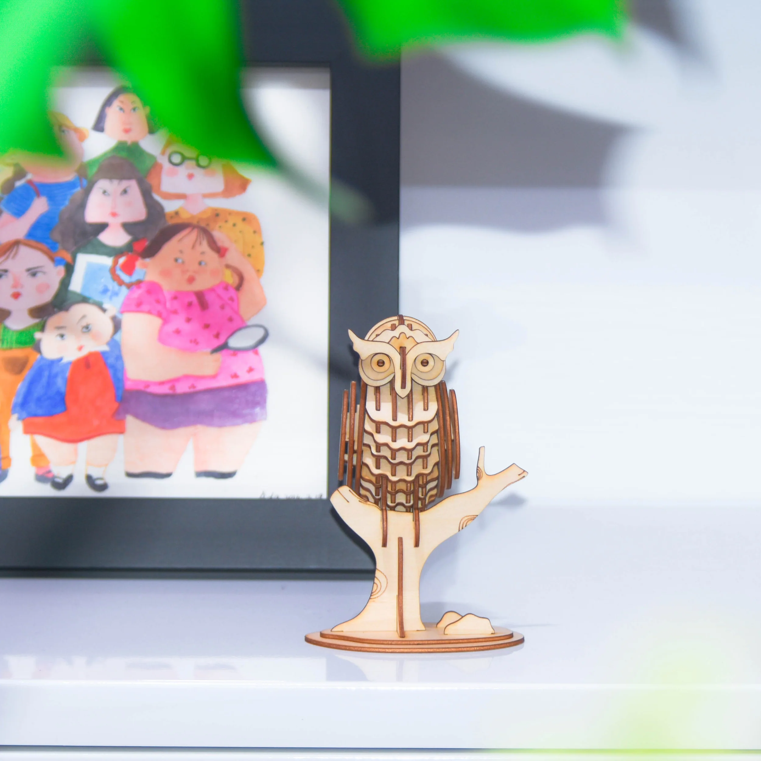 Diep in gedachten verzonken, zit deze statige uil op zijn boomtak. Hij bekijkt het leven onder zich op de grond eens en vindt er het zijne van. Zo meteen gaat hij een uiltje knappen. Dit 3D-model van een uil is bijzonder goed getroffen. De kenmerkende pluimen boven de ogen, de zogenaamde wenkbrauwen, lijken sprekend op die van echte uilen. Deze houten uil is ongeveer twaalf centimeter hoog en een perfect stuk decoratie in een nisje of hoekje. Daarbij is dit bouwpakket nog duurzaam ook!