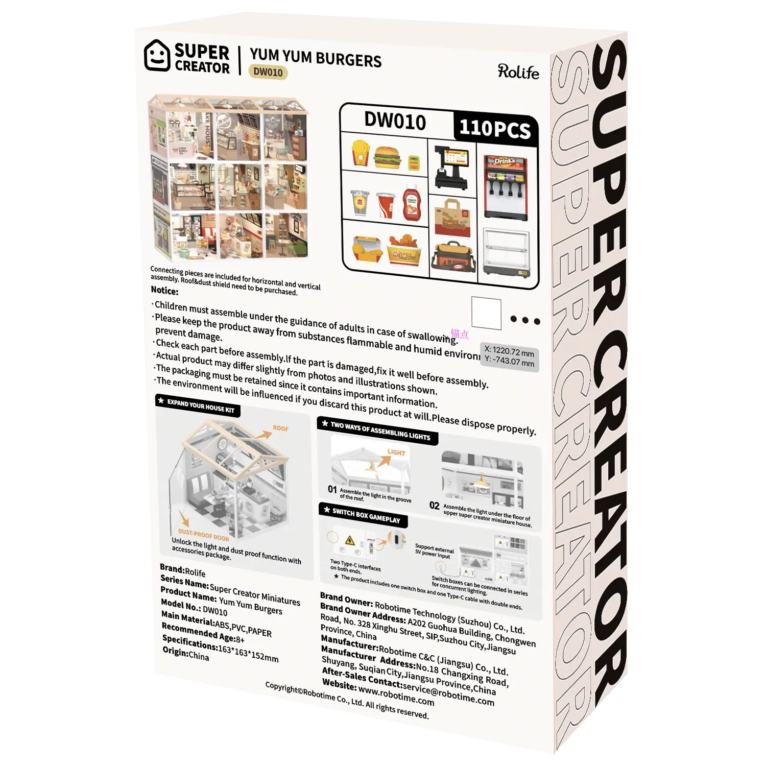 Behalve bovenstaande details loopt het water toch gewoon in je mond bij het zien van een bakje met nuggets en de drankjes met rietjes. Als je de voorwerpjes niet vastplakt, kun je met de tang de nuggest in het bakje doen. Want hoe bouw je dit kunststof bouwpakket van Rolife? Dat is erg gemakkelijk. In een paar uur heb je een leuk snackbarretje gebouwd. Je krijgt 110 kunststof onderdelen die je in elkaar klikt en stickers om details zoals de platen op de muur te maken. Het licht kun je aansluiten met stekkertjes. Daar heb je wel een plafond of dak voor nodig dat je bij ons kunt bestellen.